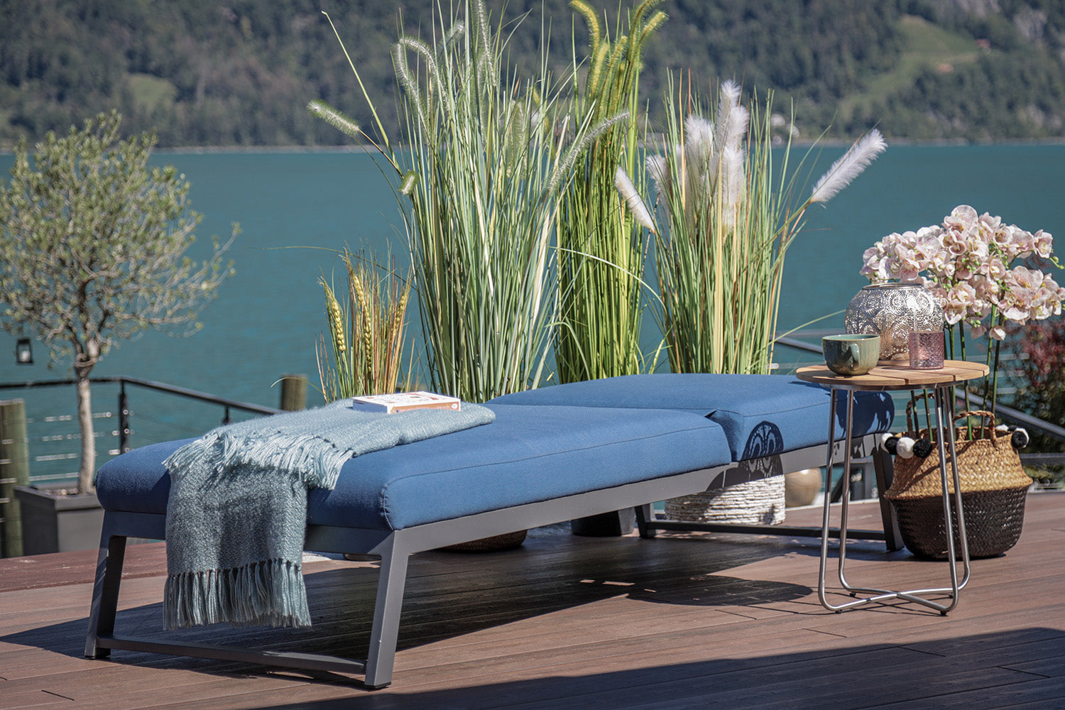 Sind Sie noch auf der Suche nach dem passenden Liegestuhl? Die Ellbrella Liege verleiht der heimischen Terrasse ein noch grösseres Wohnzimmer-Flair. Qualitativ hochwertig mit Sunbrella Stoff und dem grossen Liegepolster darf diese Liege ungedeckt im Garten und auf der Terrasse stehen bleiben. Die Outdoor Stoffe Liege Ellbrella ist nicht nur schön fürs Auge sondern besonders funktionell & mit bestem Outdoor Material hergestellt. Grosse Liegefläche: L 197 x T 74 cm. Rahmenfarbe schwarz, Outdoor-Stoff bluestorm.